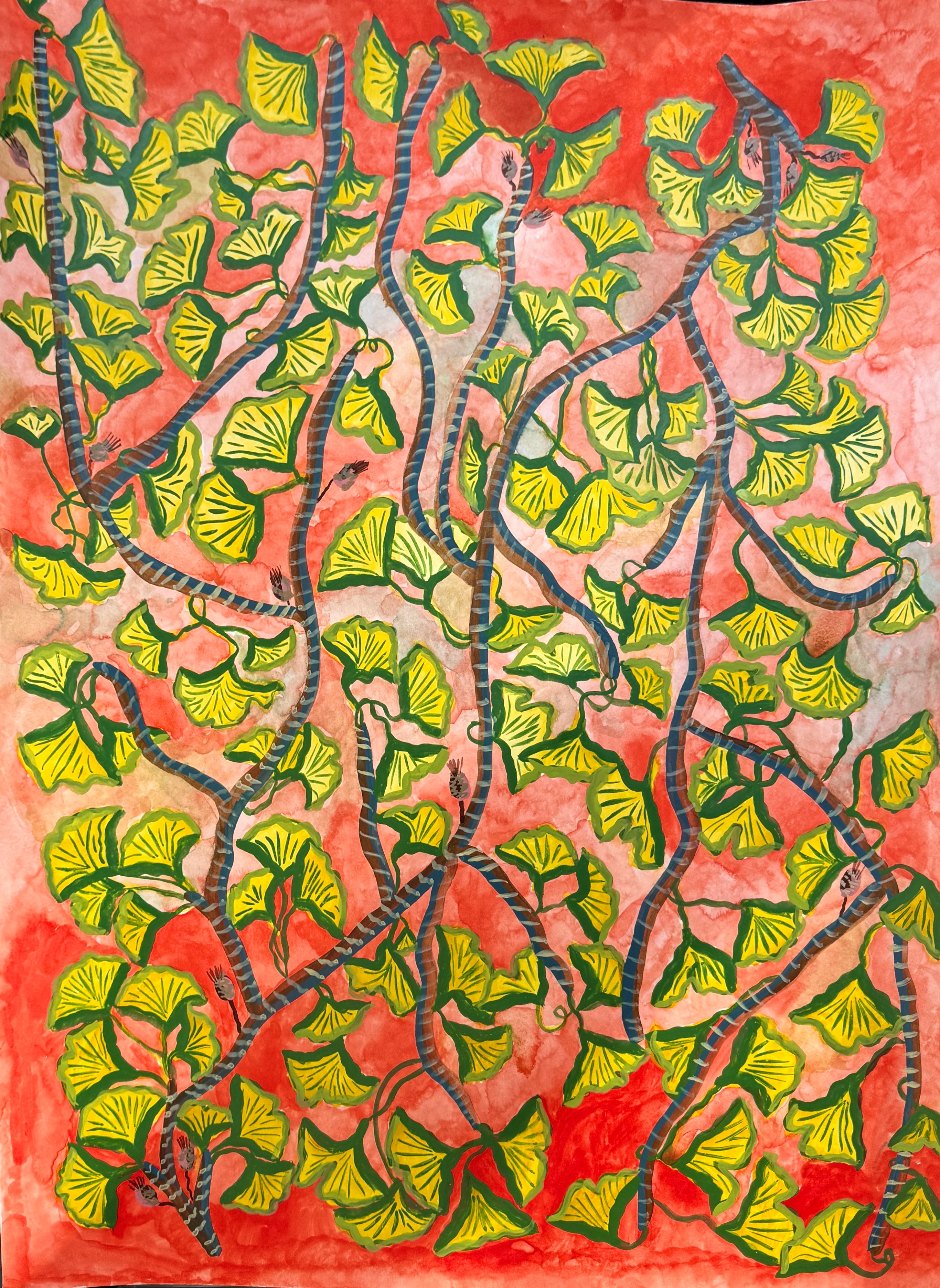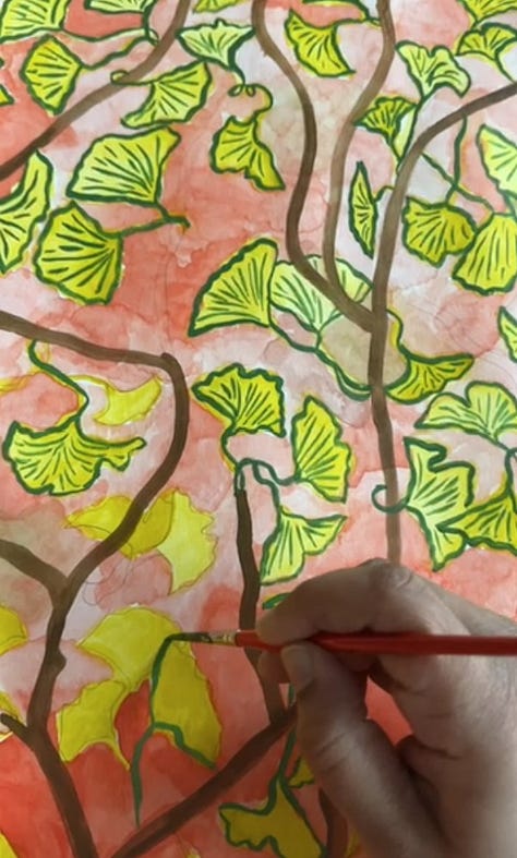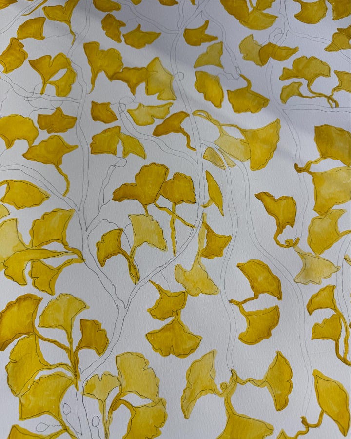 At the end of 2024, as the last yellow ginkgo leaf fell to the sidewalk with the gust of winter’s breath, I found myself thinking about it all over again. All those years of fascination, all those notes, all those seasons of watching this ancient survivor. It was time to honor it the only way I knew how. I sat down in my studio, brushes in hand, and began to paint, leaf by leaf. I started with green—bright, vibrant, full of life. Then came the yellows, warm and luminous, the color of endings that feel like beginnings. As I continued to work, I thought about how this tree isn’t just surviving—it’s teaching us how to do the same. A little tough, a little odd, and absolutely unwavering.